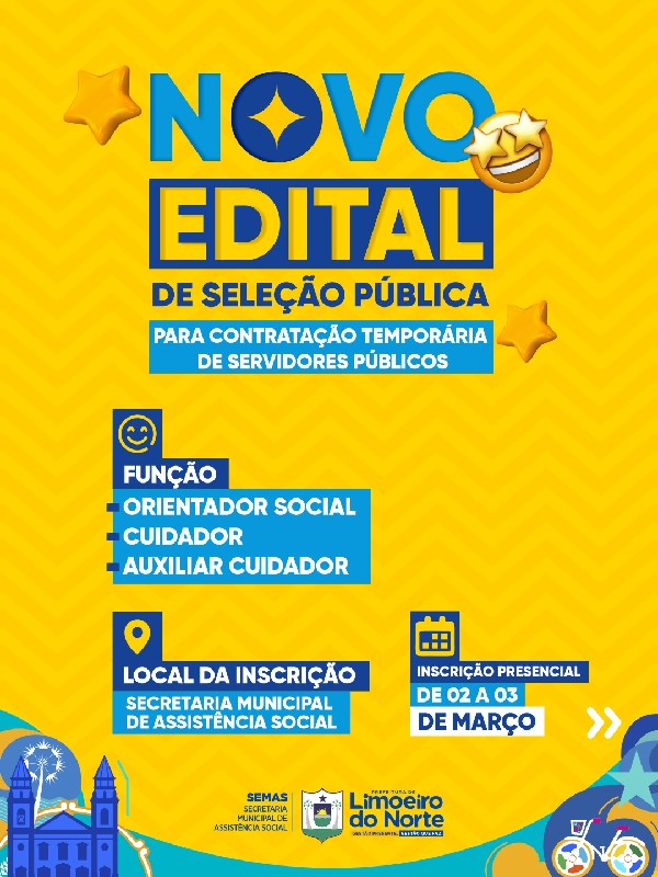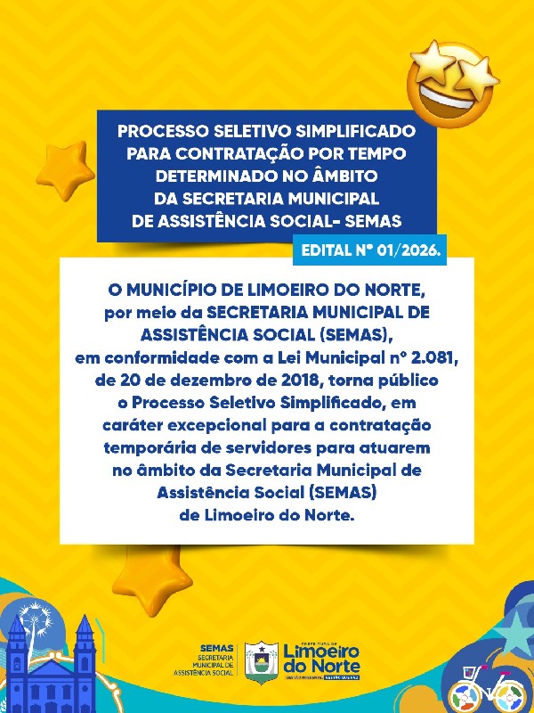 A Prefeitura Municipal de Limoeiro do Norte, por meio da Secretaria Municipal de Assistência Social (SEMAS), torna público o Edital nº 01/2026, que dispõe sobre a realização de Processo Seletivo Simplificado para contratação temporária de servidores.