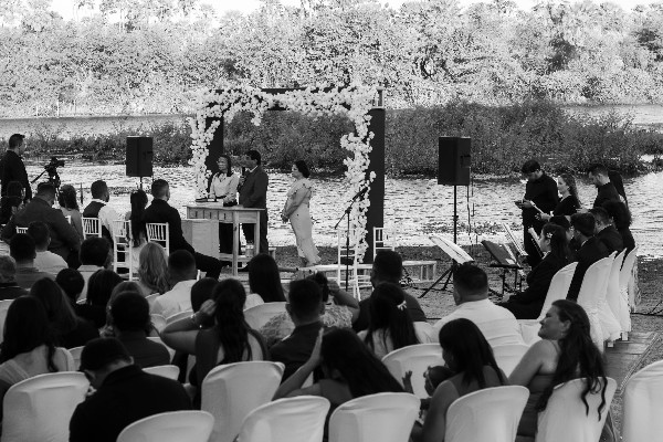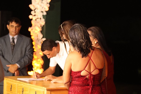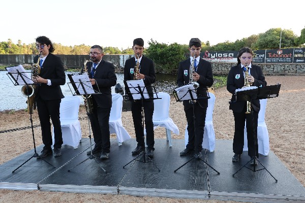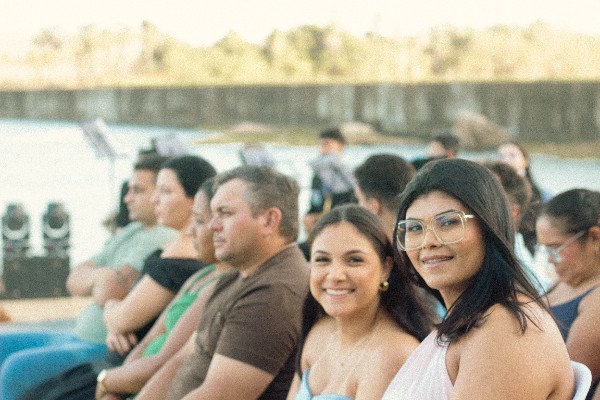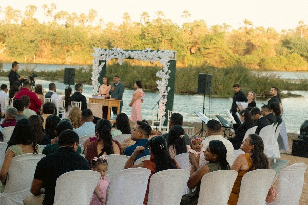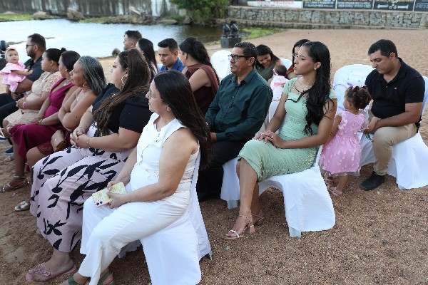 O evento aconteceu às margens da Barragem das Pedrinhas, local que ganhou ainda mais encanto com o pôr do sol e com a presença das famílias que celebraram juntas esse momento especial. A entrada dos noivos foi conduzida ao som da Marcha Nupcial, executada com sensibilidade pelos músicos da Banda de Música Maestro José Robles, tornando a celebração ainda mais memorável.