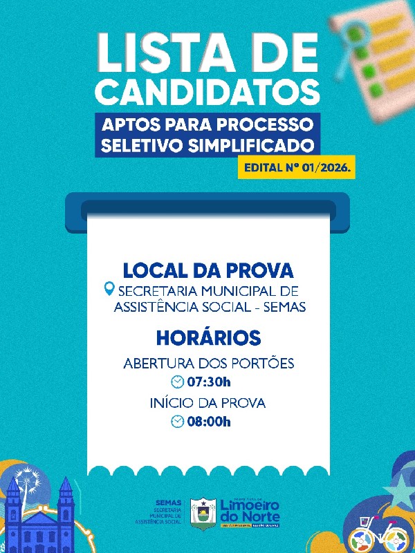 A Prefeitura Municipal de Limoeiro do Norte, por meio da Secretaria Municipal de Assistência Social (SEMAS), informa que a Comissão Organizadora do Processo Seletivo Simplificado, referente ao Edital nº 01/2026-SEMAS, divulgou a listagem dos candidatos aptos a participarem da prova escrita objetiva.